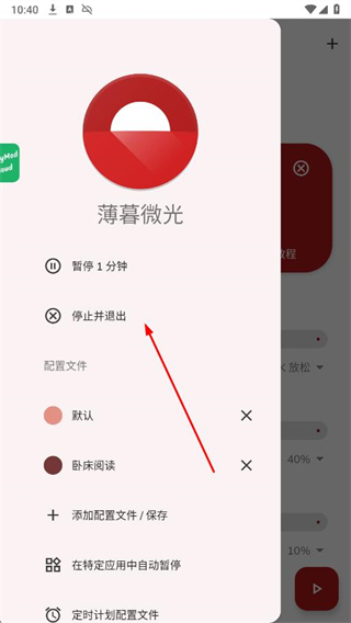 3、在側(cè)邊欄中點(diǎn)擊停止并退出,即可徹底關(guān)閉薄暮微光APP。