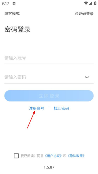 1、在密碼登錄界面點(diǎn)擊注冊(cè)賬號(hào),進(jìn)入注冊(cè)頁(yè)面。