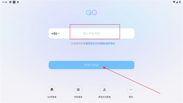3、進(jìn)入QQ登錄的頁(yè)面內(nèi),輸入手機(jī)號(hào)再點(diǎn)擊同意并繼續(xù)。