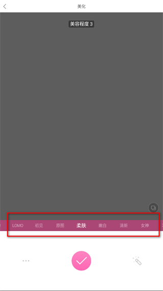 2、在美化頁面,選擇目標(biāo)濾鏡如柔膚、清新、女神等。