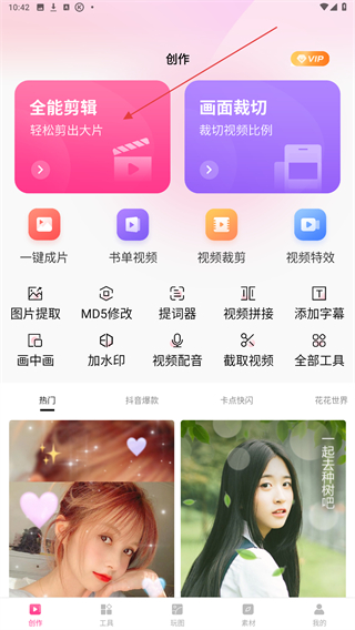 1、啟動(dòng)剪意視頻剪輯的應(yīng)用APP,在首頁(yè)上方點(diǎn)擊全能剪輯的按鈕。