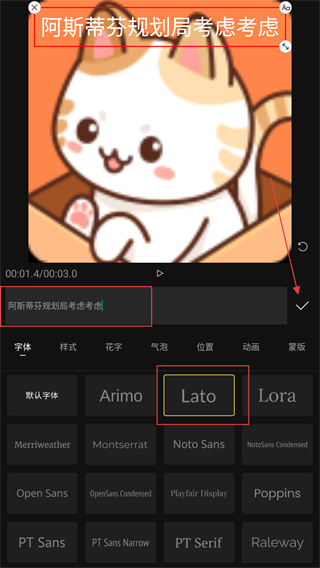 5、在該頁(yè)面內(nèi),輸入文字內(nèi)容以及選擇好字體后,點(diǎn)擊打鉤即可。