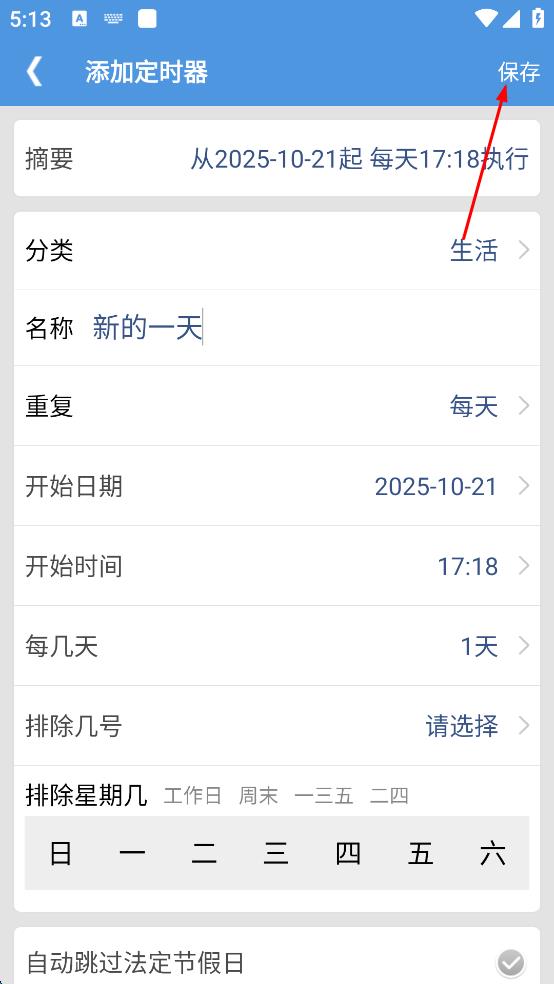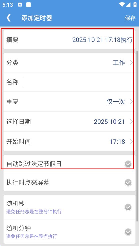 2、在添加定時(shí)器頁(yè)面,設(shè)置分類、名稱、重復(fù)、日期、時(shí)間等信息。
