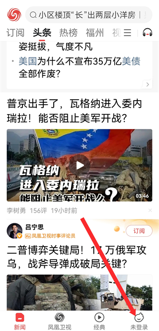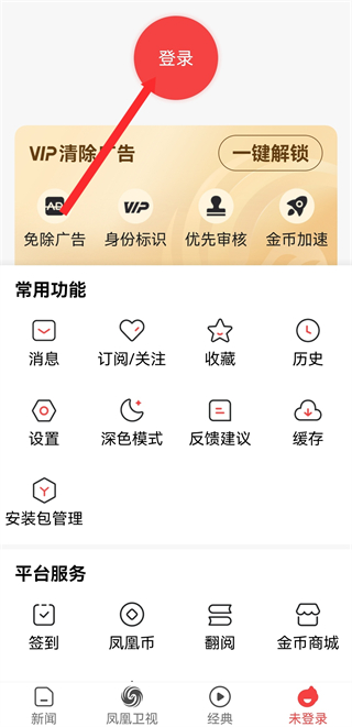 1、打開鳳凰新聞APP,點擊右下角未登錄,進入個人功能頁面。