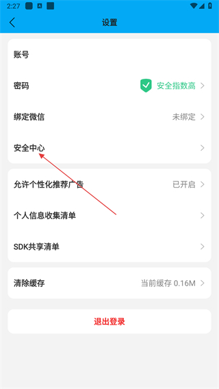 2、在設置頁面,點擊安全中心選項,即可進入中心頁面。