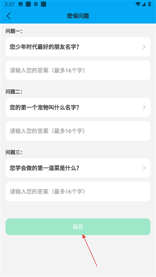 4、依次設置三個密保問題的答案,點擊保存按鈕即可。
