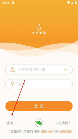 1、打開(kāi)萬(wàn)步健康A(chǔ)PP,在登錄頁(yè)面點(diǎn)擊注冊(cè)。
