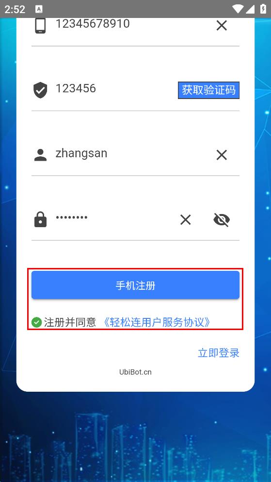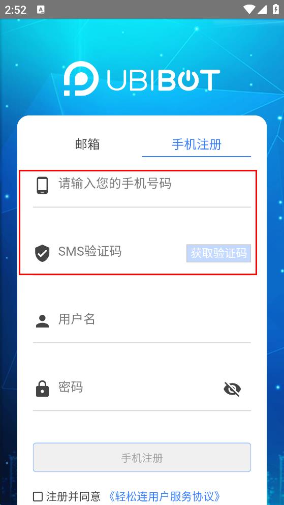 4、勾選注冊并同意輕松連用戶服務(wù)協(xié)議,點擊藍(lán)色“手機(jī)注冊”按鈕完成注冊。