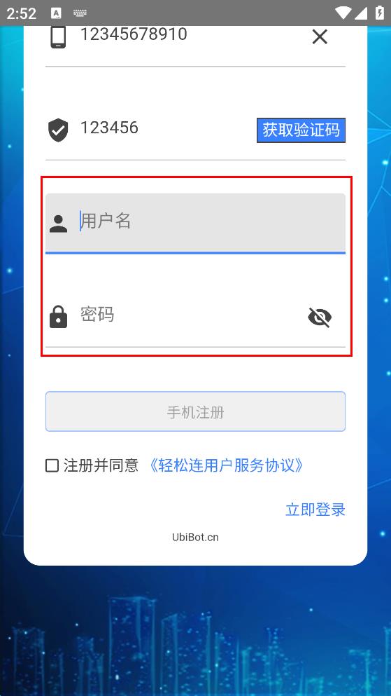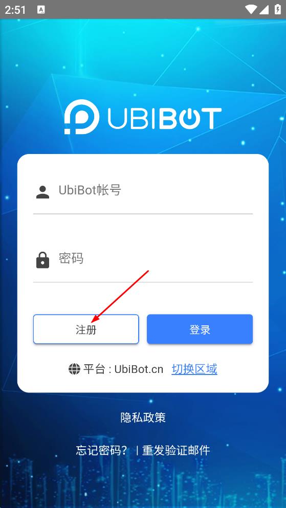 1、打開UbiBot軟件,在登錄頁面點擊“注冊”按鈕。