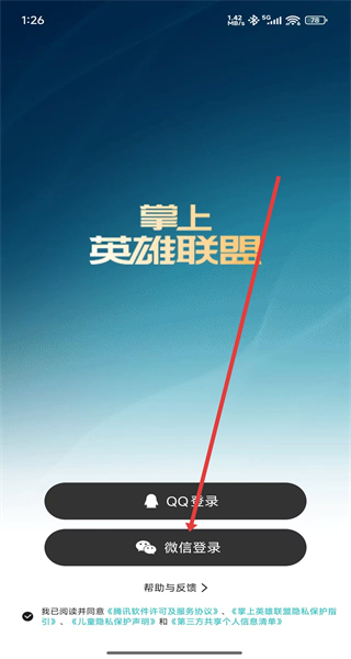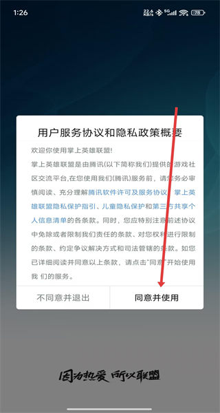 1、點(diǎn)擊“用戶服務(wù)協(xié)議和隱私政策概要”彈窗的“同意并使用”,進(jìn)入掌上英雄聯(lián)盟登錄界面。