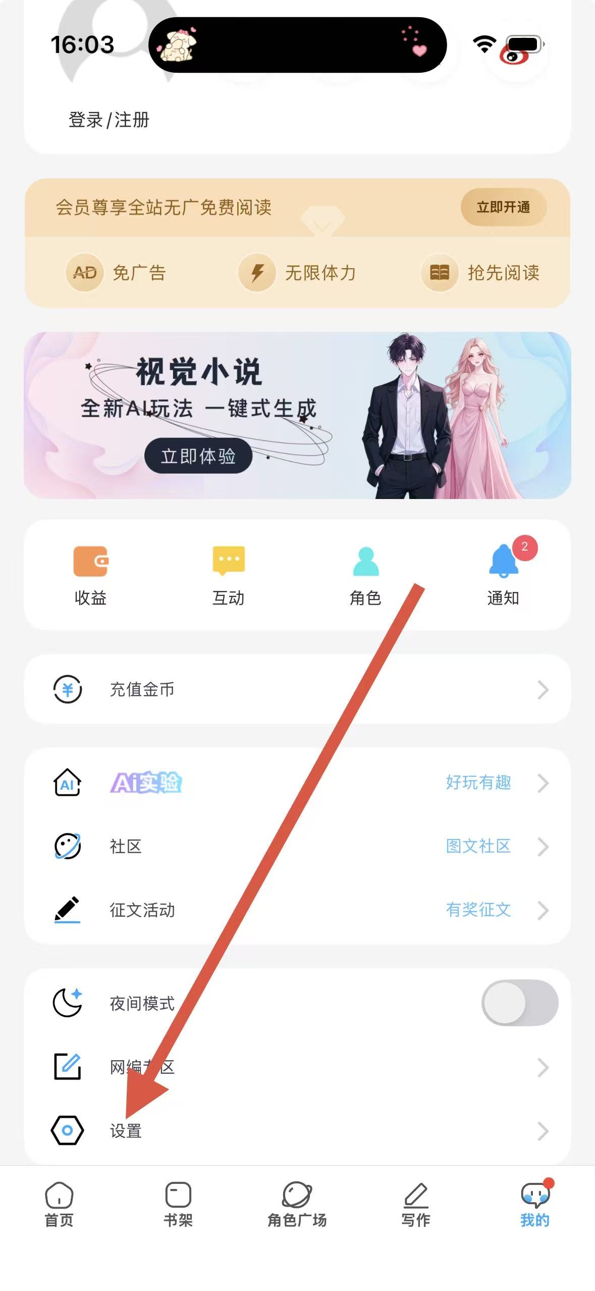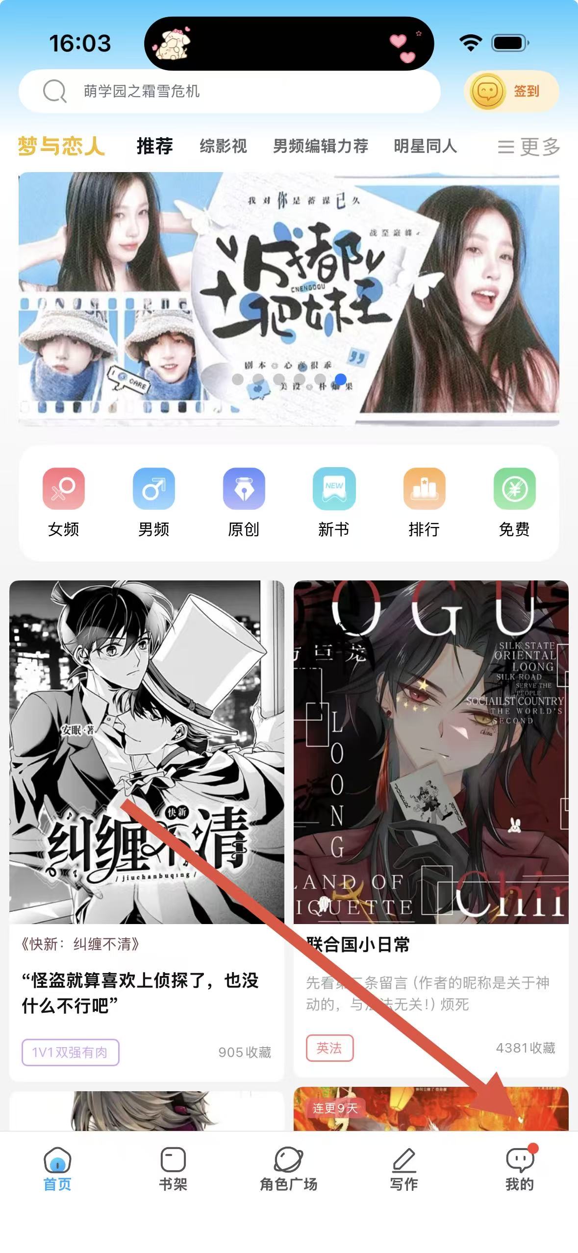 1、在話本小說首頁,點(diǎn)擊右下角我的選項,進(jìn)入個人中心頁面。