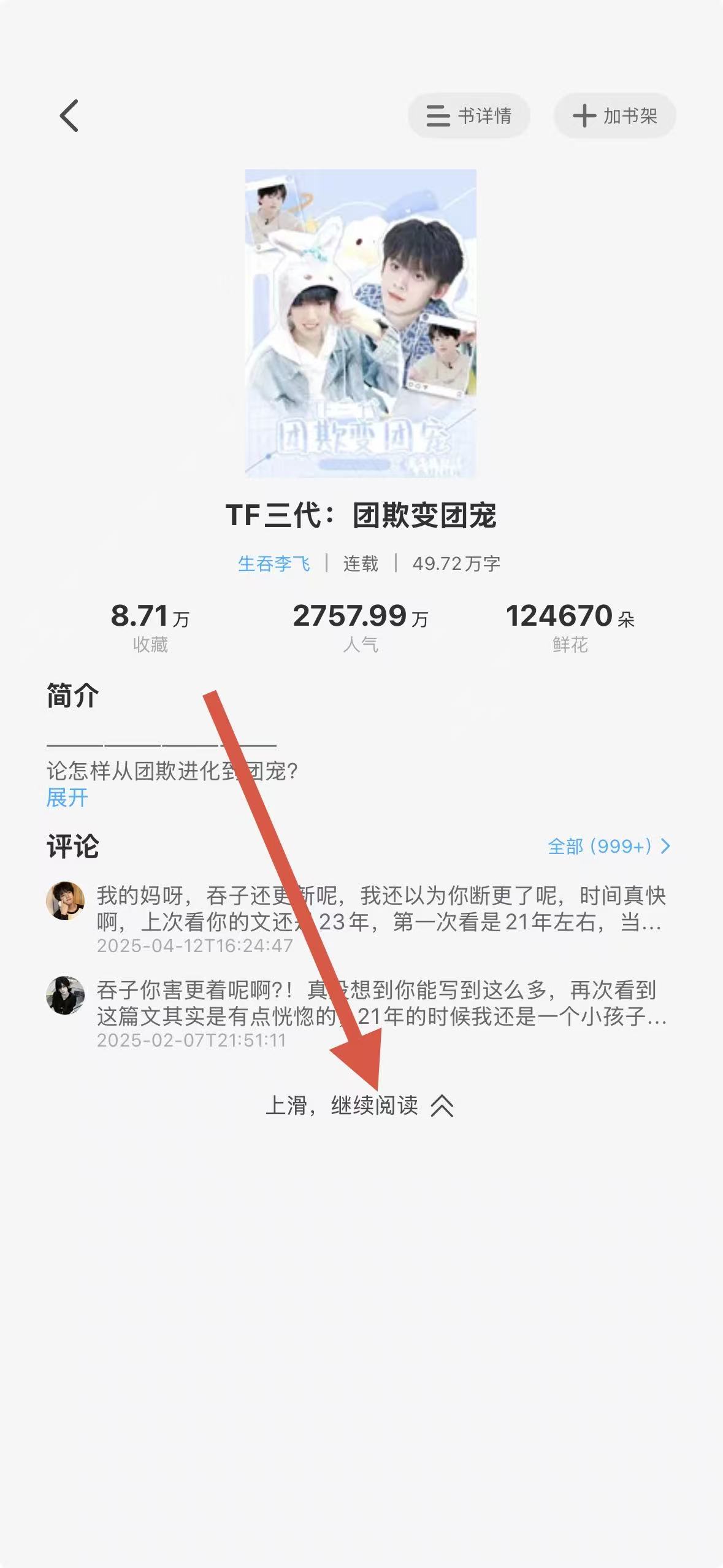 2、在小說詳情頁面,上滑屏幕點(diǎn)擊繼續(xù)閱讀選項,進(jìn)入閱讀界面。