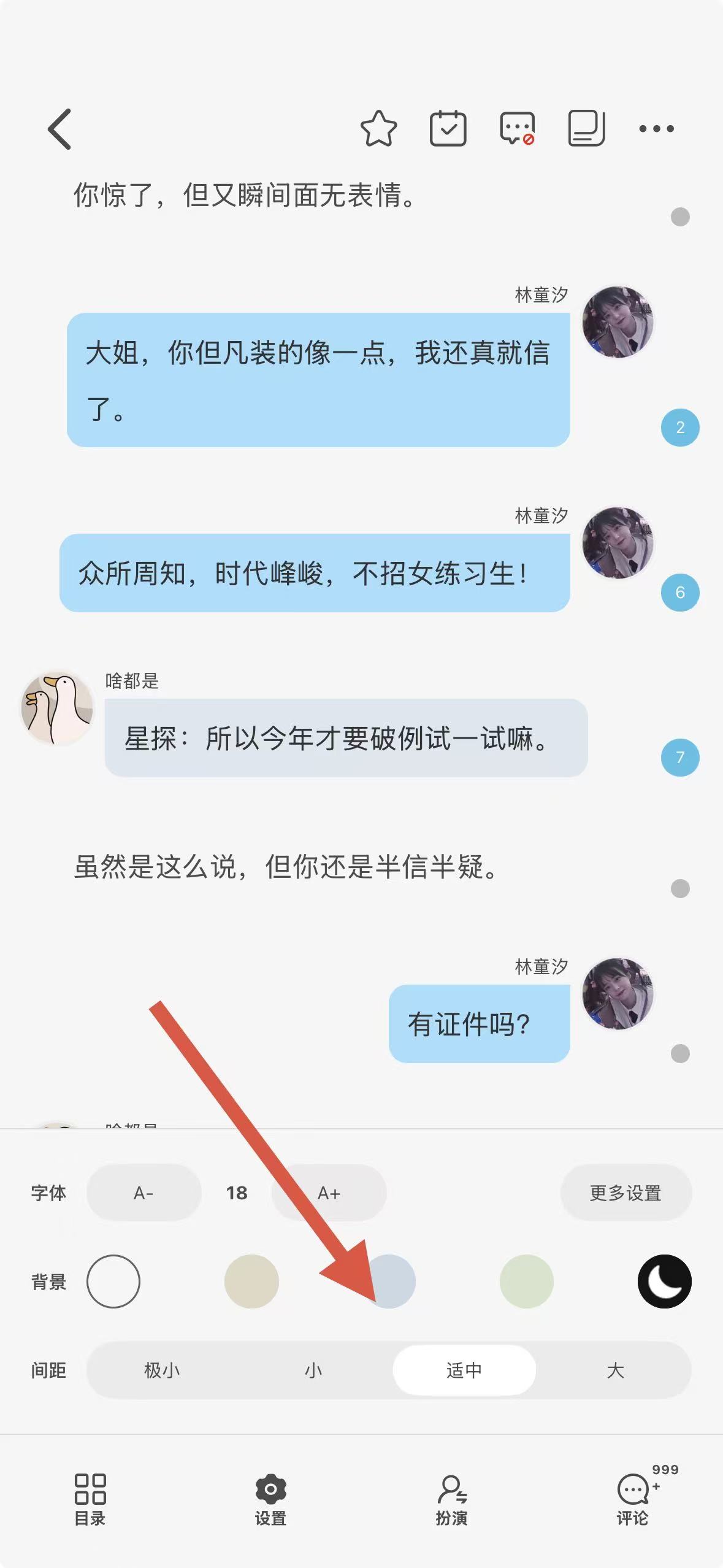 4、在設(shè)置功能區(qū)域,點(diǎn)擊背景選項中的顏色按鈕如淺藍(lán)色,即可更換閱讀背景。