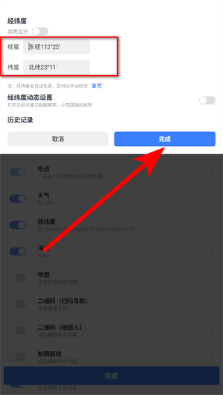 4、可手動修改經(jīng)度、緯度信息,點擊完成按鈕,即可完成經(jīng)緯度格式修改操作。