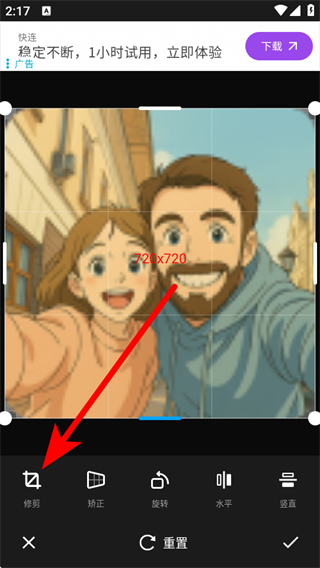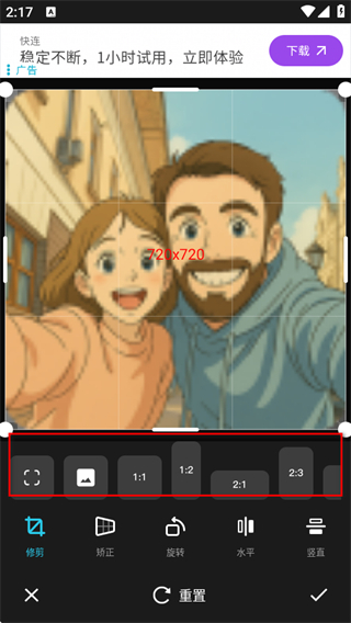 3、進入修剪頁面后,點擊底部的比例選項,如1:1、1:2等,調(diào)整圖片比例以修改大小。