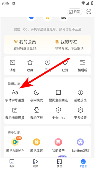 1、在騰訊新聞首頁,點擊右下角未登錄選項,進入個人中心界面。