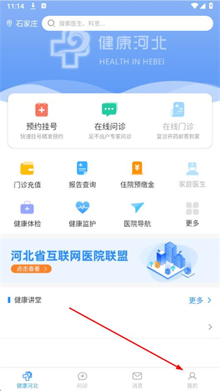 1、打開健康河北app,點(diǎn)擊首頁右下角我的選項(xiàng)。