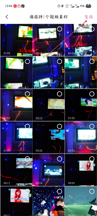 2、在視頻素材選擇頁面,選擇一個視頻素材后點擊完成。