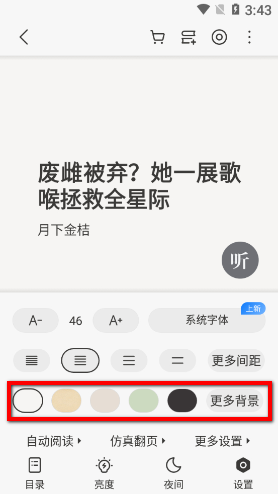 4、在設(shè)置菜單中,選擇喜歡的閱讀背景,即可完成閱讀背景設(shè)置。