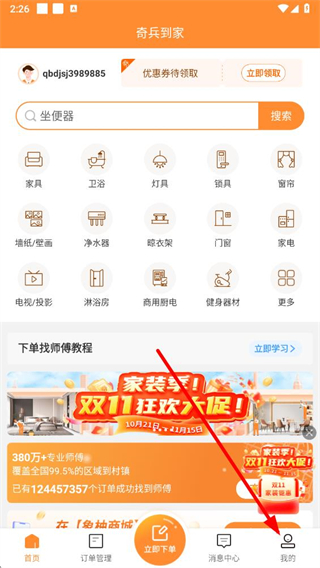 1、打開奇兵到家APP,點擊底部導(dǎo)航欄最右側(cè)我的進(jìn)入個人頁面。