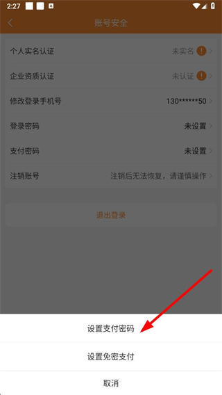 4、在操作選項框中點擊設(shè)置支付密碼選項,按提示完成支付密碼設(shè)置操作。