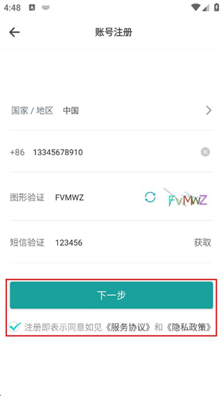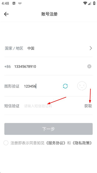 4、勾選注冊(cè)即表示同意如見服務(wù)協(xié)議和隱私政策,點(diǎn)擊下一步按鈕。