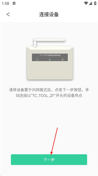 2、在連接設(shè)備頁面按照提示將設(shè)備置于內(nèi)網(wǎng)模式后,點(diǎn)擊下一步。