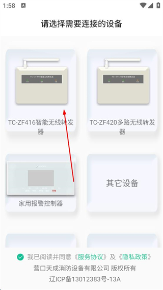 1、在設(shè)備選擇頁面選擇需要連接的設(shè)備,如TC-ZF416智能無線轉(zhuǎn)發(fā)器。