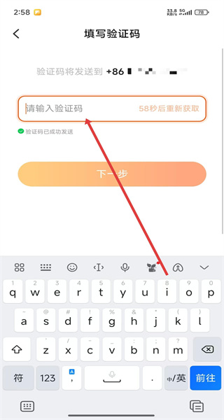 2、進入“填寫驗證碼”頁面,輸入收到的短信驗證碼,完成身份驗證。