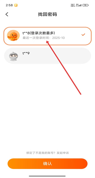3、在賬號選擇頁面,選中需找回密碼的目標賬號(如登錄記錄中的常用賬號),點擊“確認”。
