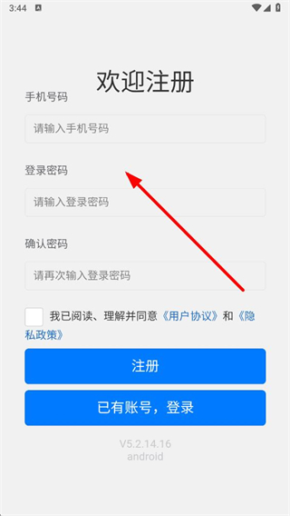 3、在注冊(cè)頁(yè)面輸入手機(jī)號(hào)碼、登錄密碼并確認(rèn)密碼。