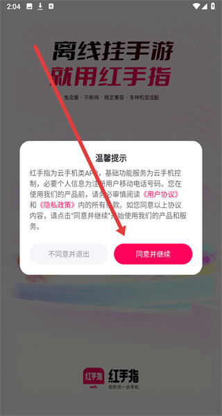1、在打開紅手指app后,可以通過點(diǎn)擊彈窗中的同意并繼續(xù)按鈕,進(jìn)入使用。