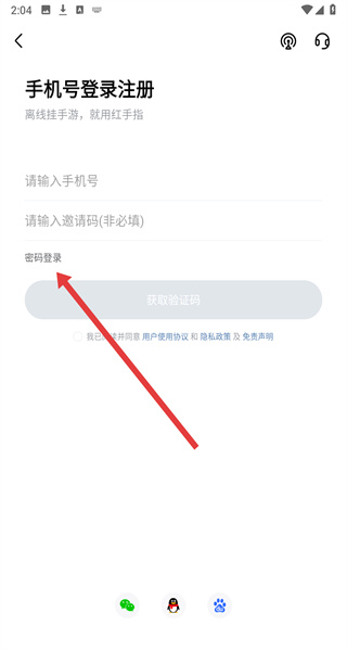 2、在進(jìn)入到手機(jī)號登錄注冊頁面中,可以點(diǎn)擊下方密碼登錄按鈕,切換為密碼登錄。