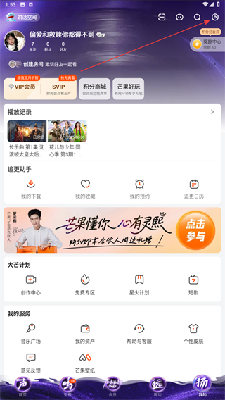 1、打開芒果tv的APP,進(jìn)入個(gè)人主頁內(nèi)點(diǎn)擊右上角的功能圖標(biāo)。