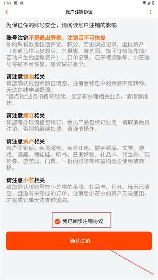 4、進(jìn)入該頁面內(nèi),了解注銷協(xié)議并勾選后,點(diǎn)擊確認(rèn)注銷即可。