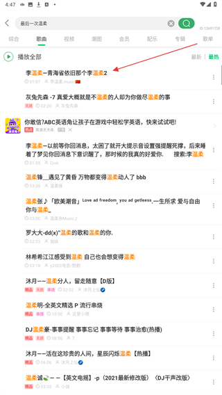 3、搜索結(jié)果出來后,找到對應(yīng)的目標(biāo)歌曲點擊名稱即可。