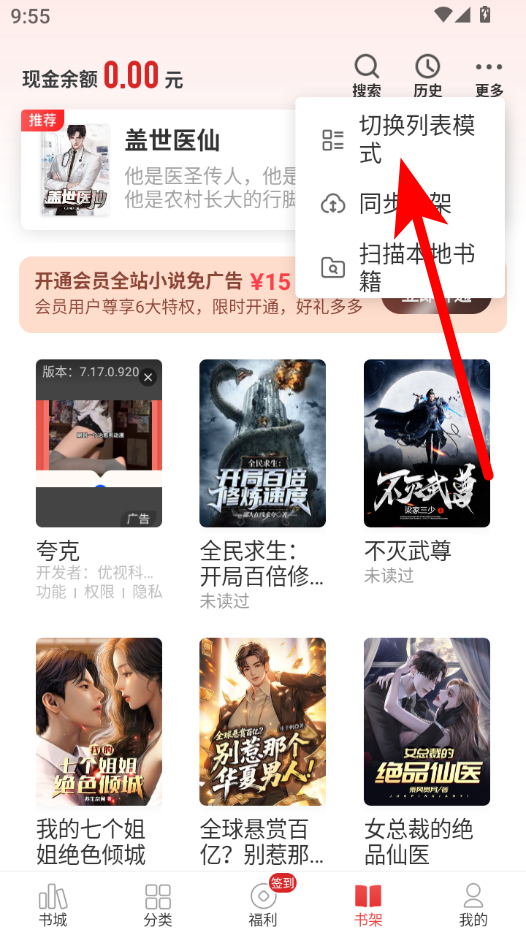 3、在功能菜單中,點(diǎn)擊切換列表模式選項(xiàng),進(jìn)入列表模式切換流程。
