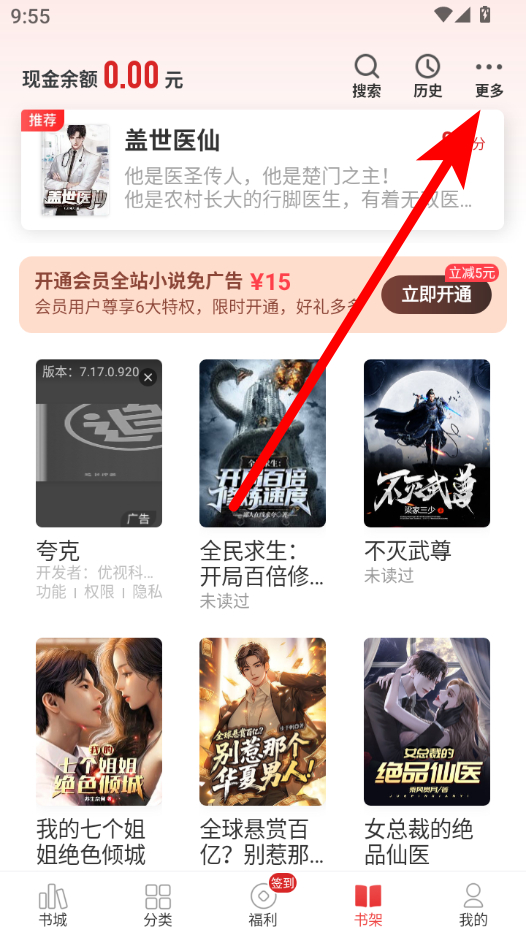 2、在書(shū)架頁(yè)面,點(diǎn)擊右上角更多選項(xiàng),展開(kāi)功能菜單。