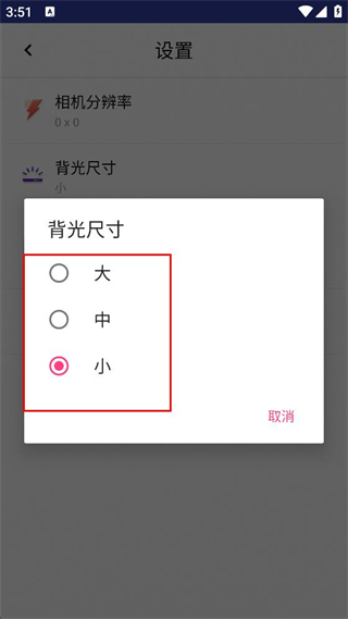 4、在背光尺寸選擇窗口中可選擇大、中、小三種尺寸來設(shè)置背光尺寸。