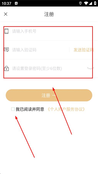 3、輸入手機(jī)號、驗(yàn)證碼,設(shè)置密碼,勾選協(xié)議后,點(diǎn)擊注冊。