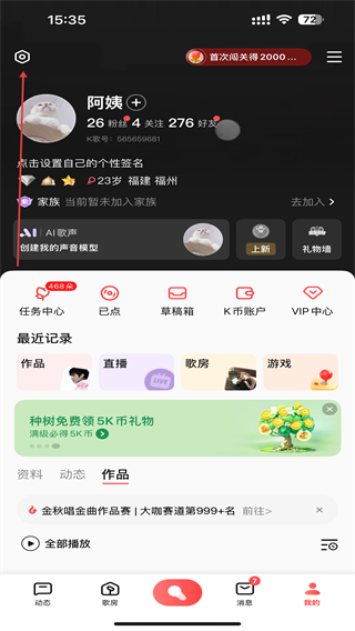 2、進(jìn)入個(gè)人主頁內(nèi),點(diǎn)擊左上齒輪狀的功能圖標(biāo)。