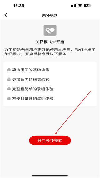 4、進(jìn)入關(guān)懷模式的界面內(nèi),點(diǎn)擊下方開啟關(guān)懷模式即可。