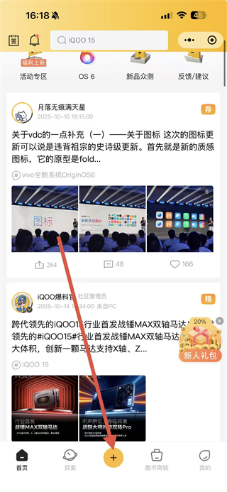 1、打開(kāi)OPPO社區(qū)應(yīng)用,點(diǎn)擊底部導(dǎo)航欄中間的加號(hào)按鈕,進(jìn)入帖子編輯頁(yè)面。