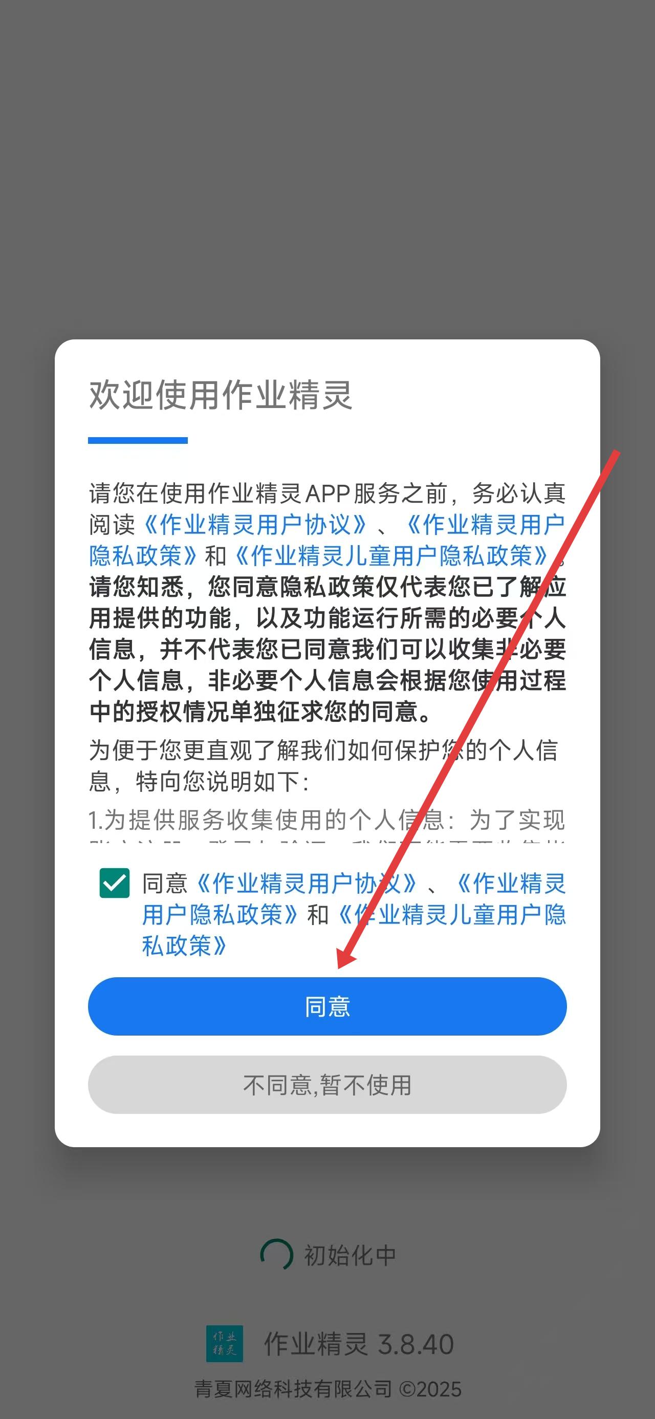 1、打開作業(yè)精靈app后,點擊彈窗中的同意按鈕進入使用。