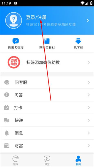 2、在“我的”頁(yè)面中,點(diǎn)擊上方的登錄/注冊(cè)區(qū)域。