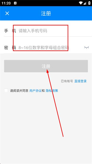 4、填寫手機(jī)號(hào)和密碼,點(diǎn)擊注冊(cè),即可完成注冊(cè)。