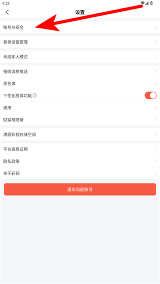 3、進(jìn)入設(shè)置頁面后,點(diǎn)擊賬號(hào)與安全選項(xiàng)。