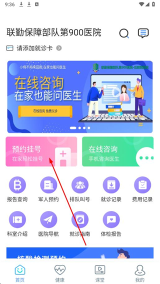 1、打開(kāi)第900醫(yī)院互聯(lián)網(wǎng)醫(yī)院公眾端APP,在首頁(yè)點(diǎn)擊預(yù)約掛號(hào)。