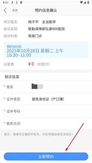 5、確認(rèn)就診醫(yī)生、醫(yī)院、科室、時(shí)間及就診人信息,點(diǎn)擊立即預(yù)約,完成掛號(hào)預(yù)約。