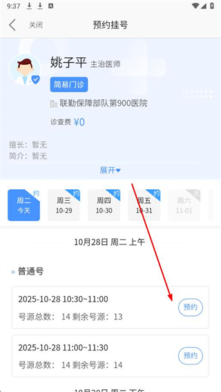 4、進(jìn)入醫(yī)生預(yù)約掛號(hào)頁(yè)面,選擇就診時(shí)間并點(diǎn)擊預(yù)約。